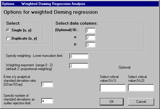 For each type of analysis, an option dialog appears, here shown for Weighted Deming Regression Analysis: